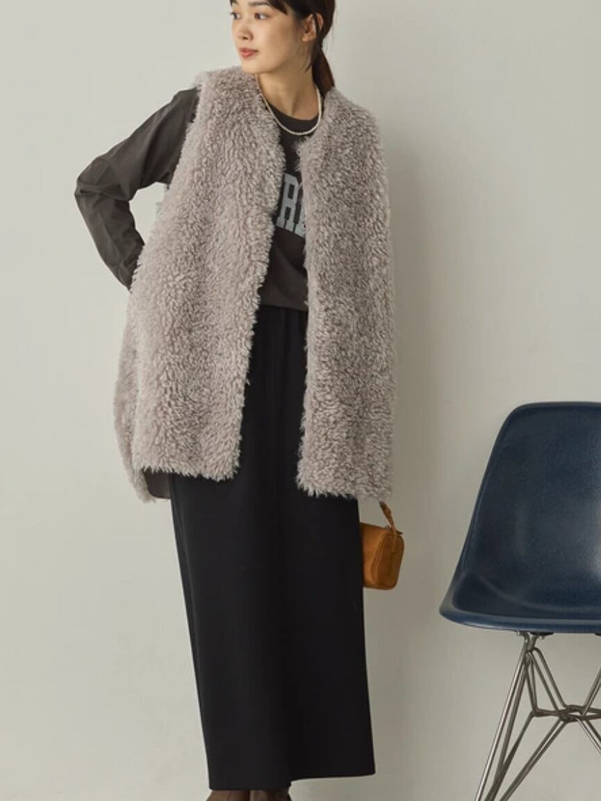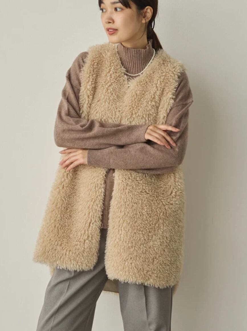 ふんわり柔らかなプードルファーと、なめらかなスウェード調の両面が楽しめるリバーシブルベスト。