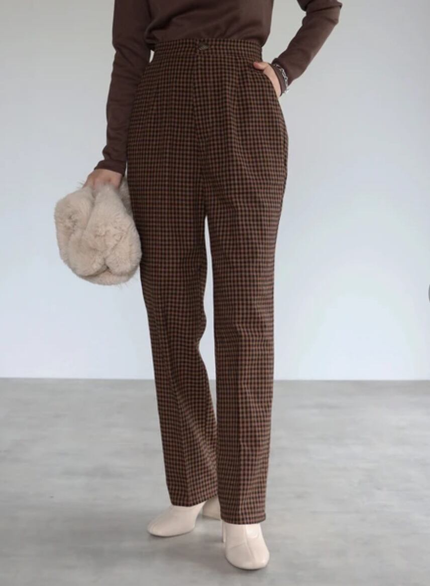 落ち着いたトーンのギンガムチェックが着まわしやすい。楽なのにきちんと見えパンツ
